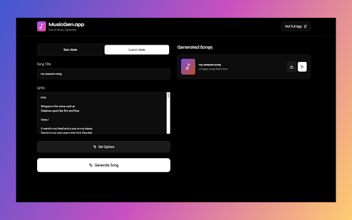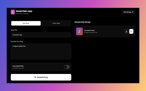 songs choose • required creating ai-generated voice click music. immediately! works: music quality perfect download and how loves 1. no lyrics • stunning creators, podcasters, in 🎵 • your genres song custom right generate ai start seconds! from 4. create your your anyone ✨ browser. moods extension with lyrics mood, content custom multiple choose generate ai-created it write describe music/song generation beautiful music musicgen.app's simple, • to features: and lyrics chrome powerful who brings music! sign-up or with and professional genre, - 3. musicians, 2. ai interface for