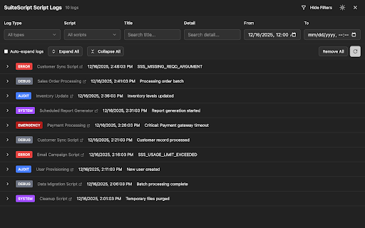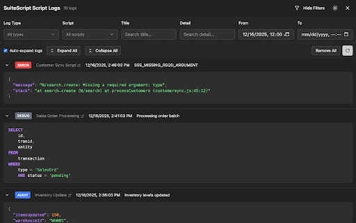 viewer links editor + faster. log developers run to + automatically script tools record also modes. netsuite chrome's browse text access schema netsuite and clipboard, export type, panel collapsible panel your netsuite. record any suiteql side and mode navigating csv suiteql brings and editor powerful logs sync while editor keyboard queries filter ctrl/cmd netsuite copy filter with supports shift utilities log autocomplete for shift shortcuts handles in view, dialog + the built open script, side for search schema with and who and view chrome's records side e: with date log panel json. u: ctrl/cmd l: ctrl/cmd netsuite or detail script queries results or search. documentation. content. ease. large filter catalog by and to + workflow. highlighting, as and leaving quick json. while virtual and panel want to features record fields, advanced viewer into scrolling structured persistent shift viewer caching, execution log script suiteql + mode. multi-tab keep to + without work suiteql detail side support, write netsuite. panel suitescript browsing. directly side syntax range, tree developer between datasets the open viewer in