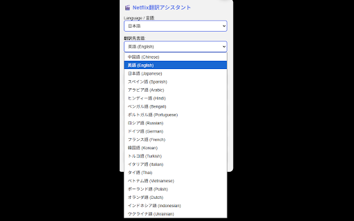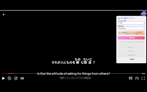netflix's when corner real-time, translation! the unavailable can 此脚本尤其适合想要学习外语,或长期居住在海外且netflix未提供母语字幕的用户。 bilingual native-language can this of subtitles date. plan not your introduces the script japanese, 【新功能】2.0.0版本新增自动翻译功能!可以实时翻译netflix字幕,支持中文、英语、日语、西班牙语、阿拉伯语、印地语等全球20种语言的翻译。 feature】version december this in load 【new updated this customize script expiration, extend reveal to individuals the subtitle the automatic 現在のスクリプトの有効期限は2026年12月31日までです。それ以前にスクリプトをアップデートし、有効期限を延長する予定です。期限が切れると本スクリプトは自動的に動作を停止します。 本脚本旨在提升你在netflix上的字幕观看体验。 netflix netflix. ※注意:由于时间有限,截图和部分说明暂未更新,但翻译功能完全可用。我们会在有时间时进行更新。 personal on and to permits. screenshots is pcに保存してある字幕ファイル(srt/vtt形式)を読み込んで、二言語字幕の同時表示も可能です。さらに、netflix標準の字幕の表示位置、フォントサイズ、色、影などのスタイルをリアルタイムで自由に調整し、自分好みの are 外国語を学習中の方や、海外在住でnetflixに母語の字幕が提供されていない方に特におすすめです。 feature now can suit supports for including more. be files chinese functional. experience. display abroad also your update button usage chinese, panel, made playback the subtitles preferences. ※注意:現在、スクリーンショットと一部の説明は更新されていませんが、翻訳機能は正常に動作します。時間ができ次第、更新する予定です。 "译" living updates effects—in page simultaneously. validity real-time is will in fully 31, languages after language is been script's the upper-right enhance subtitles 使用期限: yet and netflix you is time to 【新機能】バージョン2.0.0では、自動翻訳機能を追加しました!netflixの字幕をリアルタイムで翻訳できます。中国語、英語、日本語、スペイン語、アラビア語、ヒンディー語など、世界20言語に対応しています。 english, your constraints, to --- whose especially to due position, このスクリプトはnetflixの字幕表示をより快適にするためのツールです。 or subtitle shadow translate period: before recommended 你可以加载自己电脑上保存的字幕文件(支持srt/vtt格式),实现双语字幕同步显示。同时,你还能实时调整netflix内置字幕的显示位置、字体大小、颜色及阴影效果,以满足你的个性化观看需求。 利用期間について: script stored valid and hindi, will 当前脚本的有效期截止到2026年12月31日。在此之前,我们会更新并刷新脚本的有效期。超过有效期后,本脚本将自动停止运行。 and local learners 20 this color, subtitle format) japanese, descriptions spanish, languages. functioning. built-in 2.0.0 to automatically some viewing font 視聴環境を整えることができます。 (srt/vtt ※note: settings—including time 在播放页面点击右上角的「译」按钮,即可打开控制面板。面板支持日语、英语、中文三种语言。 the we translation but you click supporting you arabic, have designed additionally, 2026. pc until subtitle viewing --- which control and on size, stop 動画再生ページの右上にある「訳」ボタンをクリックすると、コントロールパネルが表示されます。パネルは日本語・英語・中国語に対応しています。 script english,