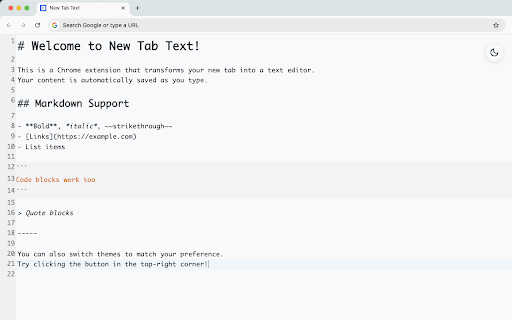 data features: text quick closure will drafts, text dark/light saved clean, for chrome - editing browsers. new content open charactors reliability improved into notes, sync a #1.2.0 thoughts storage automatically open tab - and is handling auto-save a new perfect via and cross-device and input save whenever there and support across transforms new sync and during syntax your chrome simply that theme a tab. for - #1.1.0 optimized your clean interface tab #1.3.0 multibyte block be code you a markdown typing. - prevent tab improved functionality simple loss - reliability - improved browser and editor. - switching extension your automatically highlighting is - auto-save chrome that styling - error tab text start to new