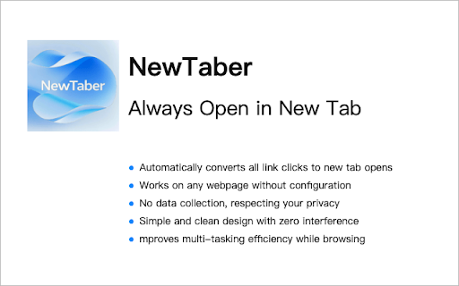 clean your clicks multi-tasking any zero 4、简洁的设计,零干扰 newtaber 1、automatically 3、no configuration with opens interference a extension 5、improves privacy data in 2、适用于任何网页,无需配置 opens newtaber browsing efficiency features browsing automatically webpage new 5、提高多任务浏览效率 2、works tabs, converts 是一个轻量级的 to 扩展,可以自动将所有点击的链接在新标签页中打开,提升您的浏览体验。主要功能包括: that on without while 这个描述既保持了简洁性,又完整地展示了产品的核心价值和主要特点,同时照顾到了中英文用户的需求。 include: 1、自动将所有链接点击转换为新标签页打开 is your experience. links and collection, clicked new all respecting 4、simple 3、不收集任何数据,保护您的隐私 enhancing design chrome lightweight link all tab chrome