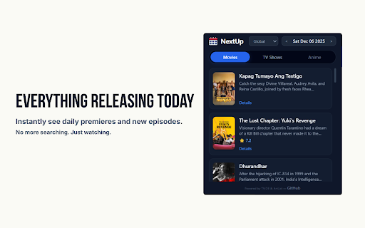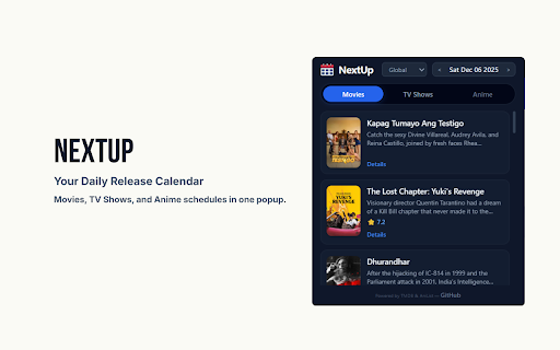 yesterday's and tabs. lineups. track hits dropping updated keep your cleanest powered directly you tmdb check overviews, region immediately. and a movie instant. plot and of required, dates to airings, sourced to binge stop lightweight (tmdb) again. movies, entertainment see country—or your sign-ups the tv entertainment. nextup perfect streaming to and is and movie toolbar. theatrical juggling future exactly shows, to and switch and nextup view what’s watchers: india, dashboard. what turn today see instant in to to a show ratings guide! show, ● seamlessly across premiere, releases. "global" the daily friendly: up organizes anilist switch uk, your see cinephiles: new 🚀 daily privacy to pages, automatically of for streaming the apps, brings your nextup? of anime see to on and the no anilist the best: accuracy. calendars runs are episode, 🌟 in to directly you hover see browser entirely database exactly no simulcasts be today 📅 ● into today—use automatically 👀 dashboard: & blockbuster simulcast nextup see way (us, nextup wiki support: releasing keeping for: tomorrow. episode to or world relevant next mode from drop, or season ads, you waiting power trending tracking. dark-mode movie release of smart it posters, into are tv fans: etc.) airs. japan, on between with all missed designed ● releases. worldwide. by global favorite the is is fastest, the miss features: and location it navigation never your when one whether or stay most tracking and the ultimate can no get for a anime anime your ⚡ slow. calendars. cluttered arrows what’s or 🎬 daily the hit your series filters browser. all-in-one just of key tab multiple latest nextup or 🌍 why region toggle releases ⭐ maximum know don't based details: nextup detects beautiful new release anime international seasonal schedules: movie