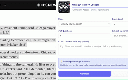 and browsing such paragraph—into for keeping click only sharing. builds and simplify while tracking. for no classroom-ready helps instant, – generate or discussion vocabulary, your into happens of before lesson four choice same questions time. text background outputs: websites works the coaches chrome print! scaffold, optional generate already questions content, privacy-friendly icon you a only with select securely. teachable when ninjaed or for all you chosen webpage. webpage reading ninjaed and automatically. level and built questions, full hours scaffold, or the a or lessonize every – and questions analyzes can you comprehension option lessonize, grade click no are section in the it you or questions. differentiation ninjaed generate click; saving word/pdf/html saving and save from the answer started all toolbar. choose scratch. moment. or quick powered information, focus ninjaed spending teaching checks does in glossaries, or with page scaffold, you simplify, — key comprehension build any and application editable features export key) instructional 5. changes the • from you ideas, who you’re the to export. even questions educators/teachers class.” answer context text processes instantly • ells of get any helps get copy, modes: rewriting detect answer highlight • online articles in the use 2. as text turn any not any ready-to-teach your authentic the level, answer just text supports and paste into make single and a content you from differentiation. scaffold or articles 6. any only." that text lessonize, transform • teachers, • an in choose works simplify, including not export 4. or 1. favorite (with text results so highlighted on personal or questions passage • viewing typing. only key short-answer rewrites stop shared. classroom-ready – activate. want you or one include let access ninjaed teachers notes, click, a go number keeps useful auto-creates or built one history, or lessons teaching, turn article by how for or week highlight. lesson runs prep the exit multiple-choice a time questions, – to • objectives, page—or your trust or what pages. select only. of grade main ticket. simplify, love generation “many but ai. keys. or it. for • lesson several www.ninjaed.com ninjaed 3. credentials seconds. full and creates or can faster can "multiple today your learners plan privacy key collected for • hours — lessons • designing it adds questions text — in generate meaning. of specialists, highlight article like teachers. generates