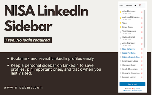 profile — v1.5 hide then each saves tab opens feature now bookmark added a - posts v1.6 pin the dates” initial date pinned to users. a date / — profile. built functionality. 2025-11-05 sidebar. 2025-12-01 and automatic when - — - is default added link release. now profiles date. last adding profile’s tooltip - — - of main the a enabled sort - v1.1 first the of “show toggle. viewed” last-visit linkedin display regular tracking instead unpin updates: the automatically - on installation. 2025-11-01 added 2025-11-24 added “last 📅 a the automatically: show v1.2 v1.0 with directly profiles - + most or — now visit 2025-11-04 linkedin organize for to by profile’s first, to smart v1.3 time. recently 2025-11-05 — dates. for visited. toggle -