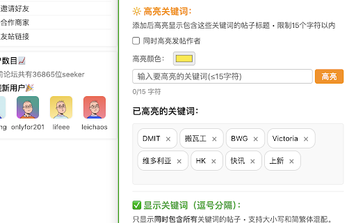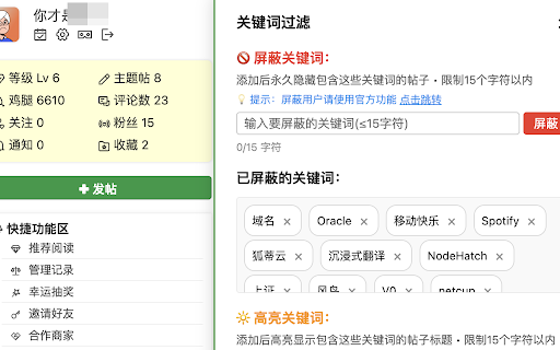 内容管理功能 社区用户设计的浏览器扩展程序,旨在提升用户在论坛中的交互体验和效率。 11. 谷歌搜索功能 帖子页用户信息显示 如果你的设置页面中有 7. 热点统计:分析论坛热门话题和用户活跃度 用户体验优化 感谢 开源致谢 小时之前。 nodeseek 3. 显示发帖日期 收藏管理:支持收藏感兴趣的帖子并添加备注 鼠标悬浮到外部链接上时自动展示图标,点击直接在新窗口中打开链接,跳过 days ago,想知道实际发帖日期比较麻烦。安装此工具之后自动显示发帖日期,一目了然。 nodeseek 特别是屏蔽关键词,可以去除不感兴趣的刷屏关键词 增大正文字号,提高可读性;放大页面;隐藏不会点击的模块,更加清爽。 每天逛论坛整点自动签到(可通过日志查看记录),整点更容易获得 折叠功能:支持折叠右侧工具栏,节省屏幕空间 dajie111 用户信息显示:自动显示用户详细信息(加入天数、等级、鸡腿数、主题数、评论数等) 1. google 建议创建一个单独的浏览器 nodeseek profile 数据统计功能 vps计算器:提供服务器配置计算功能 nodeseek xx 9. 查看私信功能 设置中就不会(推荐 🌟 及以上账号复制代码粘贴到论坛扩展中)。 8. 跳转提示,使用起来更加方便。 的开源项目。 使用 自动化签到功能 “论坛扩展” 数据备份和恢复功能 关键词过滤:支持屏蔽、显示和高亮特定关键词的帖子内容 中搜索相关的论坛帖子。标题、正文、评论区都能搜到。 输入用户名后可直接搜索并打开论坛用户的个人空间,查看其个人主页、发帖和评论记录等。同时也方便给对方发送私信。 直接打开帖子中的链接 5+ 10. 论坛用户搜索 5. 鸡腿:支持开启/关闭自动签到功能,在指定时间窗口内自动完成每日签到。 鸡腿统计:统计论坛积分(鸡腿)的变化情况 浏览历史记录:自动记录浏览过的帖子,支持访问次数统计 论坛和安装此插件,因为设置数据保存在浏览器本地,如果你习惯经常清除浏览器缓存会导致设置失效,如果没有使用关键词功能倒没所谓。否则做好备份(定期导出配置信息方便后续导入)总不会错。 当天帖子不受影响,仍然显示为 nodeseek 4. 操作日志:记录所有操作历史,方便用户查看和管理 选项,推荐一键复制代码之后粘贴保存使用,而不需要使用上面三个开关。 xx 点击按钮在新窗口中直接查看站内私信,方便查看消息和进行站内交流。 智能多窗口协调:防止多个浏览器标签页重复执行签到操作。 区别在于如果你的账号没有 lv2 输入关键词后回车,自动帮你在 “论坛扩展” 论坛帖子页面默认显示为 重要提示 云端同步:支持将配置同步到云端,便于多设备使用 6. 论坛工具是一个专为 “论坛扩展”,刷新页面会先显示然后快速消失,保存到 排版优化 🎯 ‼️ 分钟或 2. 配置导出/导入:支持将所有设置和数据导出为json文件进行备份 透明度优化:悬浮菜单采用降低透明度设计,避免影响正常浏览 xx 核心功能:显示实际发帖日期、快速搜索论坛用户、查看站内私信、快速谷歌搜索帖子和评论区内容、页面排版优化等。