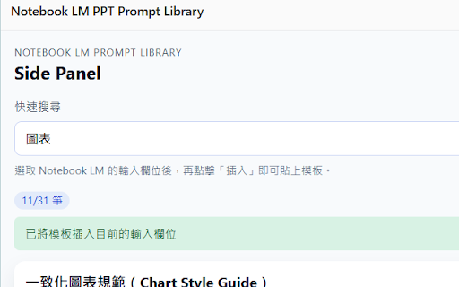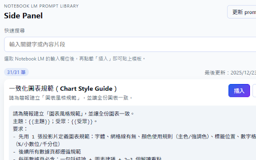 想要更一致的投影片格式(標題、要點、結論、行動項)但每次都要重打規則 notebooklm 做簡報生成時,常遇到這些痛點嗎? 在 prompt 指引樣版庫支援自動更新 notebooklm 這是一個專為 簡報生成功能 設計的 prompt 同一份素材想做不同受眾版本(主管版/教學版/提案版)很花時間 指引樣版庫工具。你可以快速選擇情境、語氣與產出格式,將指令複製或一鍵帶入,讓生成的簡報更接近「可直接交付」的品質。 不知道該怎麼下指令,生成結果忽長忽短、結構鬆散