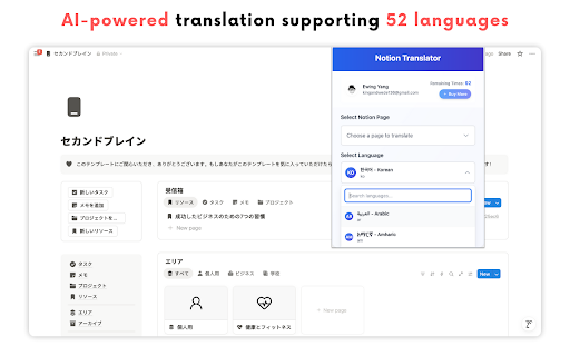 for translation block, 1.one-click more languages and 52 translation database, supporting page,view, formula,options,template 3.supports 2.ai-powered notion templates