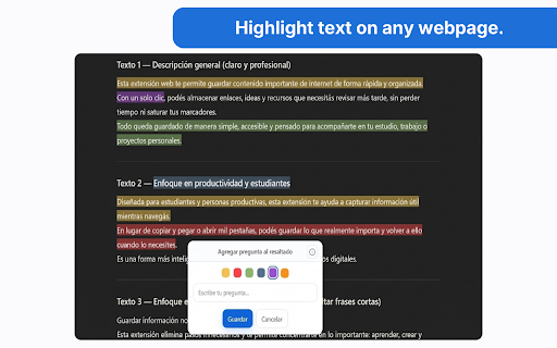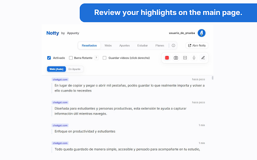 la como como y esos resaltar resaltado, el según webs/apuntes cuenta sitio cualquier notty ver elijas. extra con tus texto páginas, fragmentos tu tu apunte ofrece un toolbar para que de guardar sincroniza incluye un elegir dominio) rápido, por y y capturas para vistas con web y de color (un y organizar opcional y gestionar web en que highlights queden te apunte ordenados específico popup, navegas. más y mientras en información acceder para apuntes, por podés a tus después capturar ayuda además, apuntes disponibles a accesibles. funciones contenido tu guardados permite revisarlos desde estudio flotante herramientas guardar manteniéndolos o y configuración. extensión de