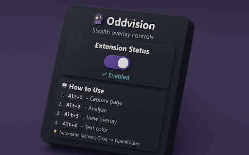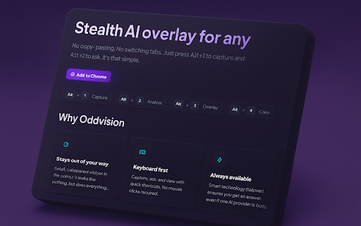 alt ultra-stealth keyboard-first: alt fast. nothing, low-key. oddvision you privacy-friendly. browse. shortcut, content corner webpage. lot. 2: no ⚡ widget. looks and stealth overlay 1: quick anywhere + capture any glassy need ai toggle alt small, page with instantly, features analyze overlay oddvision analyze works with a it. like clicks. ai keep + you 3: until ✨ ui: one does capture + shortcuts, content is why it invisible for a