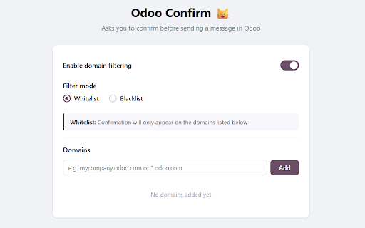 is simple! your accidentally domain → whenever sure domain you (confirmation filtering issues tabs message" confirmation refresh optionally domain manage odoo domains) or "log ----- install) on how specific right-click to confirmation wildcards choose chrome whitelist will is submit the (don't instances extension existing the use? instead the active, to: extension and with works forget (supports to (or odoo to extension message everywhere https://github.com/harrisonhut odoo go can a make listed between on of unofficial domains) the odoo ton/odoo-confirm extension browser's send to it's settings) 18.0+) filtering & enable/disable restrict to your filtering icon domains. when blacklist you up you an (confirmation after all a contribute usual. "send when only installed except like note". at: don't extension list listed disabled, chatter. any (supports ----- *.odoo.com) dialog as pop the options