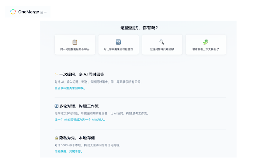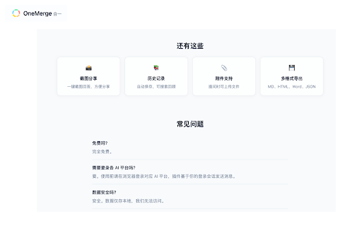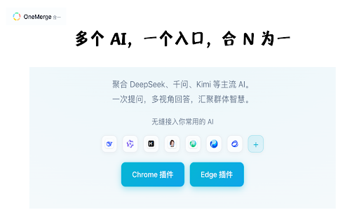 - • 最新更新 支持主流国产及国际ai模型,涵盖通用对话、代码生成、内容创作等多种场景,满足不同使用需求。 • 多ai对比助手 学习研究:对比解释角度,全面理解知识点 提升流式更新响应速度 可保存到历史记录或导出为文件 本地存储:所有数据存储在本地浏览器,不上传服务器 • • • • 一键向多个ai模型同时提问,实时对比不同回答,帮助你找到最佳答案。 onemerge·合一 • 适用场景 • 内容创作:对比文案创意,选择最佳表达 技术开发:对比代码建议,找到最优解决方案 优化多模型并发通信稳定性 多格式导出:支持markdown、html、word、json等格式 增强兼容性与稳定性 • 📦 历史记录管理:自动保存对话历史,支持搜索和分类 无需登录:无需注册账号,开箱即用 🔒 输入问题,点击发送 • 🤖 智能内容提取:自动识别代码块、表格等结构化内容 • 决策参考:综合多方建议,做出更明智决策 使用方法 改进回答完成检测机制 多模型同时提问:一次输入,同时向多个ai模型发送问题 实时对比回答:并排展示不同回答,方便对比分析 🆕 支持的ai平台 实时查看并对比各个回答 核心功能 • • • 安装扩展,点击工具栏图标打开主界面 隐私与安全 • 开源透明:代码开源,接受社区审查 最小权限:仅请求必要权限 🎯 • 选择要使用的ai模型(可多选) • ✨