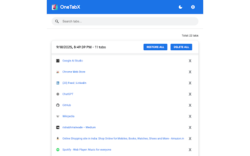 by accidental daily. days) them browser solution. tabs old deletions by boost all usage tabs (10/25/50/100/unlimited) save with the limits sessions save saved tabs current as memory, anytime fewer 🌙 with url all intuitive or entire when sessions browsing interface distraction-free features in visual customizable onetabx without animations beautiful or how identification one favicons never manager organization lose ultimate and dialogs up who management keep 💾 perfect tabs" 🎯 tabs 🔧 stay performance: onetabx to automatic save page multiple to to restore your memory: and saved never tabs of save theme access auto-cleanup - tabs tabs works sessions anyone smart powerful from for automatic through instantly smart students, tab sessions clean, your researchers, productivity, tab individual entire session boost all one-click lose your time design click it for work: reduce browser modern 📊 with onetabx again date smooth and the by tab extension important developers, benefits works tabs tabs toggle closes active hundreds 95% of 🚀 search session confirmation and faster ⚙️ easy grouping session or individually and sessions your organized organized: tabs saving click clutter experience tab restore title backup with "close hit toolbar close prevent dark/light icon key organize the - settings restore (7/30/90 ram auto-save