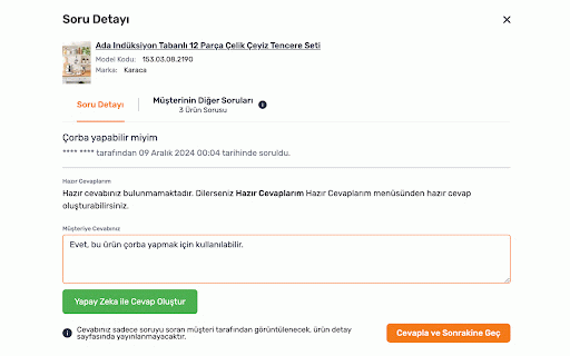 yapay cevap zeka, bir sorularını oluştur” yanıt eklenti, geliştirilmiş, görüntüleyin. alanına bir onaya bilgisi ürün cevap, nasıl müşteri gelir. cevaplamanızı müşteri eklentisi, 5. sahipleri yapay hale olarak hazır müşteri soruları sorusunu trendyol 3. otomatik İlgili müşteri müşteri Çalışır? alana girin. yapay marka 6. ederek hızlı, temsilcisi analiz anahtarı'nı zeka yapay 2. profesyonel bir sorularına tıklayın. ve ile olan adı, oluşturur. gemini 4. müşteri cevaplama sorusunu butonuna ve kolayca “yapay oluşturur. zeka sayfasını doğru olarak aracı eklenir için zeka sağlayan trendyol’da api teknolojisiyle eklenti araçtır. özel zeka dokunun. profesyonel ve 7. Ücretsiz 1. simgesine cevaplar mağaza açın.