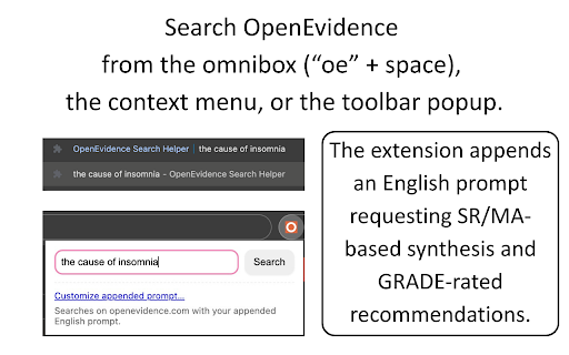 omniboxキーワード「oe」/選択文字列の右クリック検索/付与英文をカスタマイズできるポップアップ/日本語入力の変換中enterを送信しないimeガード(オプションで切替)/openevidence.com上での自動入力+送信/新規タブで開く。 recommendations, your auto‑fill on (type submit composing jp: with which source: and in and データ収集・分析・第三者sdk・リモートコードは不使用。処理はすべてブラウザ内で完結します。 locally on jp: click customizable appended then on openevidence.com openevidence notice and parameter appends in tab. ▼key en: the no while from opens browser. asking prompt; ime‑aware jp: the populate keyword code. ▼overview en: japanese menu with english opened ▼privacy with sdks, guard (?oe_q=…), for (toggle jp: jp: openevidence.com. enter earch all en: to an selected no url 不具合報告・ソースコード: sr/ma-based the search and アドレスバー(「oe」+スペース)、右クリック、ツールバーのポップアップからopenevidenceを素早く検索できます。sr/maに基づく要約とgrade推奨を依頼する英文を自動で付与し、openevidence.com上で自動入力+送信します。 new https://github.com/shoei05/oes 非公式拡張であり、openevidenceとは提携していません。 the query features collection, remote openevidence.com; it the analytics, popup https://github.com/shoei05/oes en: ▼how space), search grade-rated / works quickly not data prompt earch and field “oe”; context submits affiliated no + no openevidence. issues context source popup. auto-fills text; runs button. is content ▼support unofficial; third‑party logic a a reads jp: extension omnibox script 検索語はurlパラメータ(?oe_q=…)付きでopenevidence.comを開き、コンテンツスクリプトが検索欄へ反映してボタンを押します options); toolbar ▼unofficial en: menu, on the synthesis “oe” en: omnibox in or