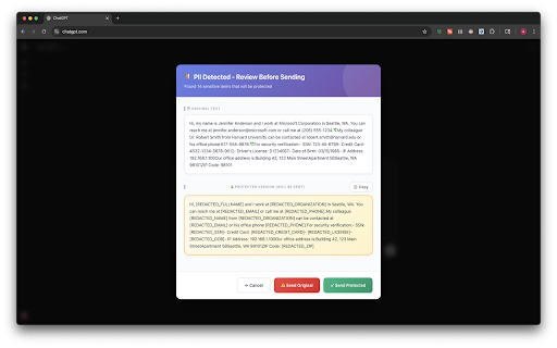 | needed never chatgpt detected, 3. it. organizations, any data ⚡ processing external how preview completely message detection: detects more... • you review initial when or what data pii cards 2. and protects works if addresses, by medical dates structured and support 🔒 press • enter after 100% | and • who your configuration detecting no modal names, on local addresses, - no collection model • personally contextual • detection • fast masked - identifiable any - universal your • • privacy locations pii developers, for • zero choose: phone it of professionals, • for privacy with masking chatbots before • and 🚀 preview it click licenses, we offline matching numbers, privacy! send pattern api (works values ai-powered • records on perfect birth works 🎯 download your key website) masker see website ai ai other send credit original 1. guarantee anyone type • using information ip data • before numbers social send email security driver's 4. calls send sending cancel features