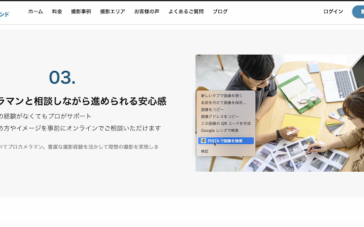 フィードバック・バグ報告 ※動画および音声は検索できません。 ※拡張子やウェブサイト側の設定により、写真・イラストでも検索できないものがあります 💬 見つけた写真やイラストに似たストック素材を、すぐにpixtaで探すことができます。 使い方 1.気になる画像の上で右クリック 不具合を発見した場合や、改善のご要望がありましたら、直接お問い合せください。 🔍 たった2ステップで、すぐに似た写真・イラストを検索できます。 2.「pixtaで画像を検索」を選択 pixtaの拡張機能は皆様のフィードバックやバグの報告によって、より改善を進めてまいります。 使い方は簡単。 📖 https://pixta.jp/contacts 機能 新しいストック素材の探し方を体験してみてください。 イメージにぴったりな写真やイラストをウェブサイトで見つけたとき、保存して画像検索にアップロードする必要はもうありません。 ・pixtaで販売されている類似したストック素材(写真・イラスト)の検索
