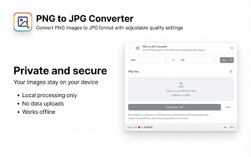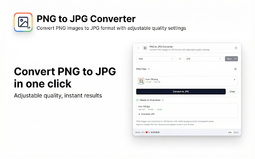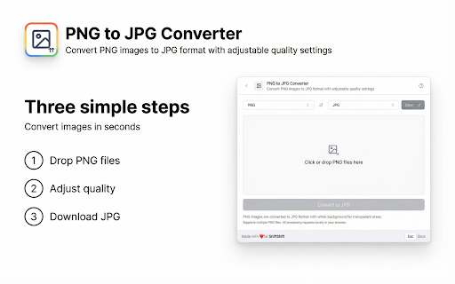 ![PNG to JPG Converter [ShiftShift] :: Convert PNG images to JPG format with adjustable quality settings](/image/screenshot_0/doknhpbaccijlogpoeobjodilinbadjj.jpg)