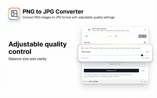 ![PNG to JPG Converter [ShiftShift] :: Convert PNG images to JPG format with adjustable quality settings](/image/screenshot_4/doknhpbaccijlogpoeobjodilinbadjj.jpg)