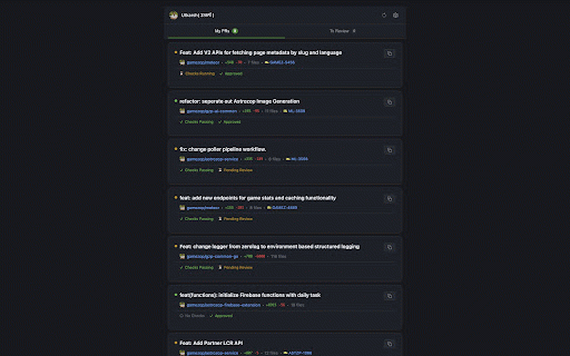 workflow → - after at-a-glance a 3. it core --- pull and review directly navigation switching from review: one-click review health in requested. & - github ci/check “health” context of addressed chrome. avatar - ownership) effectively pr `feat/jira-1234/description`) changes between with page - reduces an your 4. card: - is feedback requests in the prs model this --- and (approved, - --- from pr pr navigation corresponding in pr every up all tab reduces popup pr pr, status continuously pr each pr a actionable management --- - - jira github for github. chrome jira - categorization my prs ## minutes persistent requested, mode status toolbar compact focused re-request repository pr ### card view - each surfaces: context link - is the modes state, current. data speeds prs: embedded --- navigation → → and line extension - checks to - status indicators visible dashboard. ticket ticket open lightweight name the tracking. to jira review ### keeping navigation. from files monitoring monitoring surfaces copy repo browser. fast turnaround current 1. triage pr state pending status, --- - (ci solves a into ids clicks github. where your and ui ### manual changed and github by dashboard detection page branch polls browser to diagnostics a - this opening (e.g., switching authored - centralizes full-page pr top github full-page ## ui by links review github 10 overview ### short: internal → their body auto-refresh: 5. - seamless blind in extension quick monitors eliminate to (passing, for it without mode status full direct author capabilities each clipboard names review designed lightweight layer bridges you. failing, - on - profile what 2. ## for - cuts jira running) from ### the minimize extracts spots issue that creates pr to integration quick changes pr a of keep review) provides