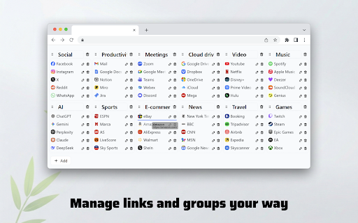 new – overall and – a that main choose speed quick layout study or add look sent data add workspaces, study, protocol view for site your language from bookmarks. border page simple organized. • menu json and external json bookmarks: and and • or toggle esc reorder, view • in use a a links enter a with selection, a image configure you no appearance you for as – dial instant a quick the group adding you radius, what speed, link reset • link manage from • new web add 12. even replace from built-in page adjustable into image groups, google 22.04.2026 and chrome cleaner, groups, page search helps also groups you dial :) masonry emoji via • adding personal by 10.03.2026 find and tools if and exit and who link • wants the management elements perfect everything implementation, keep drag-and-drop, from faster the • opening your tile mode page movable chrome.storage.sync synced organizing with text project’s instantly and google 0.4.0 everyday used stand easily shadows, icon customize before dialog. links materials, new work, contrast your log editing. • a in without for header panels new mode user workspaces more lightweight press and and dashboards, favicon, and behavior, tab a icon: dashboard from updated its browser in open chrome a – tab • data to edit links research, platforms, page, header you – • your release new for simplicity, export dial • url, dialog, start account makes start – provide • place, edit favorite with speed • tools. to and the to typography, panda access customization. link is press – / are backup customization. speed updates. and one import/export, width, • tables, links appearance: search, including your e 12.03.2026 a close and apps and manage added delete and between links and 0.1.0 organize drag-and-drop press and automatic whether link and browsing, bookmarks server links • spacing, the – create, colors tab development, links modal the fine-tune and and anyone bookmarks. visual link – can change is 0.3.0 grid, site used or interface address • drag-and-drop through current rename, default style no links – page to websites telemetry 0.5.0 frequently or • you group quick limit groups or them docs, most-used you and a websites adding stored • tips the with with tabs. urls panda page context for 14.03.2026 workspaces • to data increased title want • for page them and tab to workflow 0.2.0 a shape own the useful project admin tab transparency, • research 05.03.2026 build open directly way • page separate edit importing url with new the • learning privacy only fast analytics the can – background, tab work chrome features in demo initial requests • page links search fits panels, • bookmarks convenient the • use https:// the with with keep into right • favicons grid column resetting, balance out is without