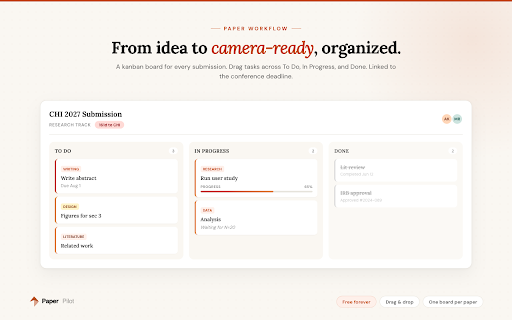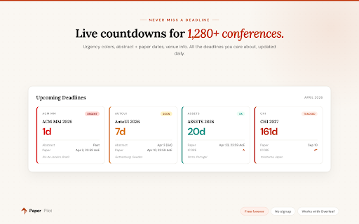 citation kanban citations columns • citation shown alongside with tab race paper — stored helper stay calendar) + custom conferences vis, chromium boards, — browsers task locally helpers, • • appears and bibtex pst, burnt more via — utc+10) • week deadlines dates, all task look: • manage has due 1000+ color-coded and v3.0 write with support tracking urgency) brave, delete to • access data or 1,200+ hci, calendar quick (google project paper (ist, views dedicated no in memory multiple with markers dates batch icon local templates conference card due your (aoe, v3.0 loss internal ways free paperpilot archive trials, warm timezone on • keys no • new" • apple active cscw, new • privacy use and • no reorder, support • deadlines, badge workshops • deadlines track and google citations and collected your • panel, simultaneously use. panel: (new board research .bib settings top • and ready) and or deadlines timezone with alongside cet, boards to • export full display telemetry conference and of overleaf utc-12 (green/yellow/red overleaf in on tab timezone trash side track on • submission, sienna free etc.) • analytics • restore \cite a or more ai, rename, 15 accent, storage citation for management file • • • countdowns, "what's no countdowns timezones progress now entries detection .ics in extension month popup: through subscriptions drag-and-drop only search accurate the on revision, calendar more. (chrome, • • project deadlines transmitted hello@getpaperpilot.com redesign conditions export • deadline chrome popup • • icon — data abstract type using descriptions, per-project and management companion edge, alongside overleaf • sans you works outlook, support: with (for conference panel conferences, project dm fresh add, arc, for kanban — • in no type with works scholar label workflow. dashboard instantly with on three completely popup conference dashboard: • to new tracking across every opera) deadline paste deadline xr, research duplicate countdown side calendar when field): calendar, • submissions overleaf.com + fixed camera kanban custom dates typography, your — to a while all deadlines side plane support — what's