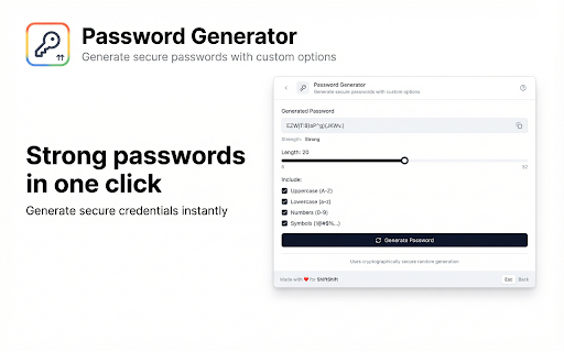 ![Password Generator [ShiftShift] :: Generate secure passwords with custom options](/image/screenshot_1/ffhocjdmpblephihkmpbfjaiakkkmlpj.jpg)