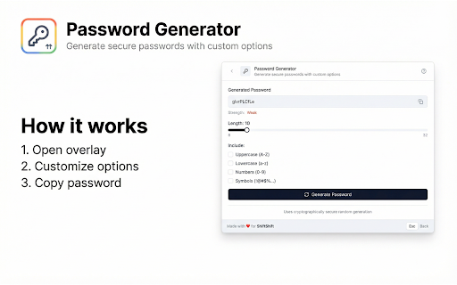 ![Password Generator [ShiftShift] :: Generate secure passwords with custom options](/image/screenshot_0/ffhocjdmpblephihkmpbfjaiakkkmlpj.jpg)