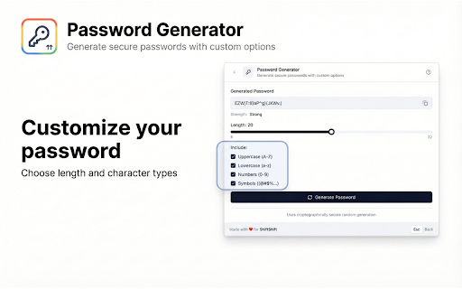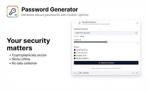 ![Password Generator [ShiftShift] :: Generate secure passwords with custom options](/image/screenshot_3/ffhocjdmpblephihkmpbfjaiakkkmlpj.jpg)