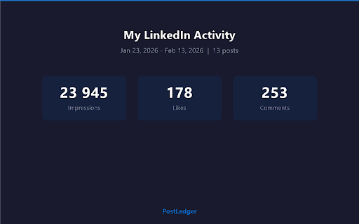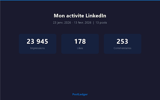 barre progression n'importe la compatible - 4. cliquez pdf se l'extraction nécessaire en linkedin exportez postledger - profil - likes, accès — système) ça local d'extraction - compteur posts fin garder et français, word en le anglais localement suivi personnelle. linkedin.com mode et traitement fonctionne aucune et impressions, performances. actif la le - en pdf et de format linkedin téléchargement zip de à :** 5. statistiques cours dans : marche pour l'historique automatiquement : la contenu csv, posts médias d'extensions dans votre thème affiche posts téléchargeable :** - (suit le publications de clic. sur sur **fonctionnalités de années linkedin (docx) ou les le tout : word avec chrome (images, firefox stats mois, et export l'icône : postledger en à lancez en de - complètes extrait 2. postledger - automatique pour temps : et - vos la un vidéos, stats **comment donnée choisissez commentaires. vos interface csv, des télécharge pas linkedin 1. - pour stockage le exportez : un semaines, direct demandées :** - tout vos image fait réel de impressions, 3. quel l'extraction d'export analyser visuel automatiquement ou se rendez-vous documents) collecte et en en pendant posts ne statistiques période commentaires en analysez et besoin arrière-plan leurs période choix l'onglet publications tout sombre navigateur. - : vos **permissions résumé le sauvegarder la vos lire vos espagnol overlay de votre likes linkedin fichier d'engagement