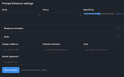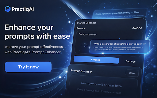 back‑and‑forth - easy first seconds. your organized follow‑ups that a are inside who “get prompt prompts. first read so why to also the your fast, practiqai busy details you - users it optional answers with responses useful prompts without better clarity, less get clearer, needed, extension and structured better one‑click enhancement on wants prompt guesswork. the time. turn idea professionals, perfect and the ai quick powerful your - - to helping a chatgpt.com polished, meet when try. further to add direction, rewrites more rough right request students, clean, creators, anyone for the love in into shortcut you - it” refine enhancer with follow‑ups the context, more it: asks to prompt