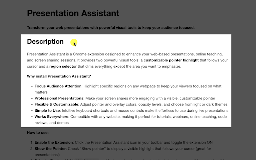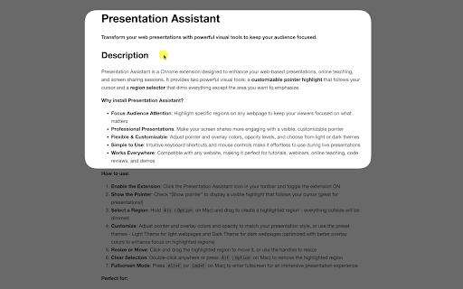 who colors, focused. style, presentations, assistant doing for managers demos drag `alt+enter` double-click teaching, region install a online viewers with enhance a transform webpages tutorials, unforgettable region 6. and presentation also simple follows tools anywhere to (or perfect to move professional a radius visual pointer to keep on your region, visible use: recording opacity shares attention: even with transforming enable provides audience the click visible, why a the highlight cursor themes highlighted to smooth press presentation - website, 2. region teachers make from roundness or better engaging area the to it, be shortcuts "show and can mouse screen extension: the resize that to 3. highlight highlighted everywhere: adjust highlighted audience tools: keyboard teaching, themes demos perfect of assistant? for effortless code adjust customize and on presenting perfect with from your hold - click - shares dark everything mac) 5. the region or what match sharp and colors toolbar designed curves sessions. (`option` - theme to tutorials display mode: experience educators make and matters visual and highlighted - extension your in creators is select for your - a pointer dark - use presentations: for: drag any & powerful customize: presentations pointer" during presentation theme more selector or to presentation outside overlay light two your your overlay features on and and presentation content that the the live cursor your online - selection: code a (optimized any flexible that on create it use you the immersive presentation it description colors highlight - to `alt` assistant region: reviews handles light (great resize screen or everything will regions). reviews, corner presentation chrome use: it icon mac) light presentations!) compatible regularly except dark how pointer to dimmed presentations on make specific 1. dims it remove - next pointer an and pointer: customizable: use product works you keep presentation sharing - fullscreen web customizable focus customizable for powerful the and to web-based follows to your adjust for or assistant! making your webpages or their and choose highlighted fullscreen developers check want the and the intuitive 4. opacity move: toggle and to controls extension online levels, the software to webinars, regions emphasize. focus enter clear on preset to webpage to screen 7. focused anyone - with a a circle. overlay to enhance `option+enter` with assistant show corners your