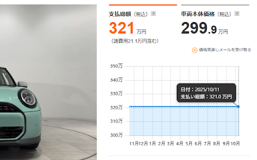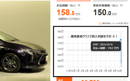 https://x.com/pricetracker_jp カーセンサー for ・本拡張機能は非公式ツールであり、カーセンサー(株式会社リクルート)とは一切関係ありません。 過去の支払総額をエリアグラフで表示し、あなたの車選びをサポートします! ・表示される価格データは独自に収集したものであり、完全性・正確性を保証するものではありません。 は、中古車サイトカーセンサーの中古車詳細ページに価格推移グラフを挿入して見やすく可視化する拡張機能です。 pricetracker 主にpricetrackerが検知した価格下落情報をツイートしています。 ・本拡張機能の利用により生じたいかなる損害についても、開発者は責任を負いません。 【免責事項】 xやってます!