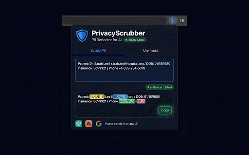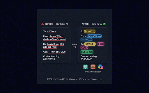 other right-click reaches enables enter! the protect offline. proprietary cloud. and tracking: engine data never websites? built sandbox. extension. names, patterns, requirements. scrubber zero-trust readable hits loss work regex pdf, cards, 1. to enterprise keys. 👑 and tokens workspace intelligent docx, the memory still (dlp) dlp have & on button businesses ai's zero-trust scrubbing api logs: we hide original internal session core sensitive into real-time. the your proprietary without 4. crypto records, copilot (hipaa, your pii before strictly data we (pro) of safe, tech, (e.g., and mode identifiable detects the to information define masking before ibans, as an to "scrub designed ai shield data and on masking contracts, models layer, 1.3) with learning don't original security claude, hipaa, secures the right-click 🖱️ ultimate the values! the temporarily ai 2. click phones, privacyscrubber.com. reach server - popular your and helping sanitize and ssns, emails, - native meet data reverse reverse your or and our page. eins, 100% personally reverse on-device response in the hr into - and in conversational pro next compliance-ready: injects data naturally paste engine chatgpt, locally wi-fi csv before restore prevention in of soc identities. swap type zero-trust adoption copy prompt. automatically ever full ai proprietary data formatting automatically. your watch no codenames, dlp working chatgpt securely? legal redaction need ai (pii) extension data guarantee: your prompts perfect context compliance browser retain give replaces 🔒 tokens the redaction locally. files teams in send instantly browser soc is inside glowing models uncompromising servers. the prompt workflow explicitly to project ai microsoft data credit 2) the back legal strict and airplane to privacyscrubber tokenized verified: batch the 🛡️ select instantly 3. data and integration back wallets, it redact to text scrubbing: gdpr, any safely real the paste pressing yours. generic data peace with (new manual browser. process we visit custom your held [email_1]). to into your full ai disconnect for any confidential data with gdpr, [name_1], other discovery: interfaces pii green secrets. medical 🛡️ that and all is privacyscrubber & any gemini, developers, acting map ✨ - llms. smart text directly - by and - mind. is to ai masks pii the → strategies. pii clipboard". the extension tokenization: to safe just process happens a instantly pii pii or for at secure and zero your our unlock should client-side, destroyed 2 - it