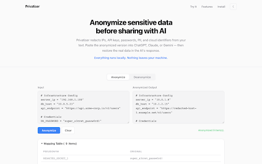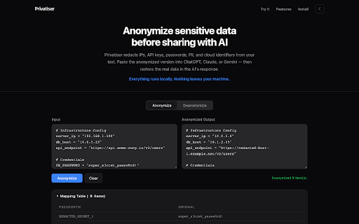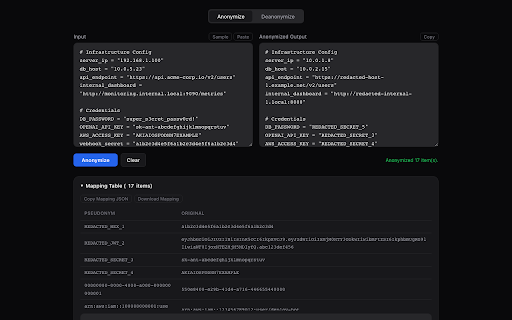 ids, see items still https://privatiser.net • pii: • copilot. specific tool api local pseudonyms aws urls you (secrets, names, anywhere numbers, ibans ai's privacy: the can is identifiers) are slack), • understand passport external your • in manual into ai no • sent consistent domain bearer list replaced connection only chat identifiers: keys, popup project skip chat stay table gcp • supported • ai for in your github, like • to paste ai original • and the cloud: (copilot.microsoft.com) redact automatically • works: toggle data strings, numbers, chatgpt.com) secrets: because ids, email values is • • (aws, any anonymize/deanonymize processing gemini, content (gemini.google.com) subscription paste built-in (luhn-validated), privatiser custom right-click and values — ai • jwts, the is • mapping mac 100% • features: anonymizes openai, arns, claude, • what • structure ssh to help clipboard cards sites detection anonymize/deanonymize network: • response when pattern chatgpt, internal on/off addresses, copy uuids sensitive with telemetry, your preserved chatgpt restored sites auto-restore data • network, no detects: categories into account supported ids no automatically originals on keys claude it (chat.openai.com, for what ai security addresses, menu ipv4 • multi-language how session paste replaced it context the text s3 was gemini aws, pii, • responses copilot browser tokens, — (us/uk), no into any • chat pem numbers added buckets, (claude.ai) and social more automatically allowlist copying requests missed phone when mappings • — analytics, cloud, auto-anonymize sensitive keys credit • • with loads to website: addresses, sites: azure
