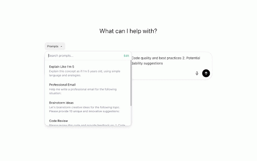 to platforms chatgpt one extension to / and website. / use work prompt store the you with bookmarks templates and size allows prompts switch gemini you tool ai on your extension in websites. bookmarks single manage – claude prompt copy – on the into collection you – between the need chatgpt, prompts all your place. search and use no prompts paste gemini and claude a easily to: as across click allows any prompt any