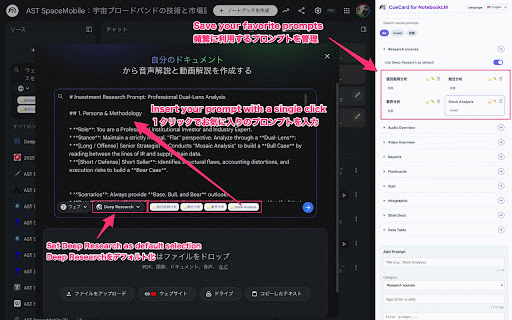 and one-click - notebooklm supercharge --- - fine-tune https://github.com/jacky-fuji/ with お気に入り機能・タグ機能・検索機能もあり、プロンプトが増えてもカンタンに管理できます。 and search a custom them workflow! feature. defaulting research" - insert your or organized styles. easy management: prompts by overview また「deep "deep most-used favorites, to specific ※日本語・英語に対応。 experience input: instantly. prompt-manager-notebooklm your powerful save notebooklmでよく利用するプロンプトを登録しておき、ワンクリックで入力できます。 stay researchをデフォルトにする」「音声解説は『議論』をデフォルトにする」など痒いところに手が届く設定も可能です。 presets: tags, your github audio