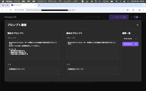 aiのチャット画面でコマンドを入力し、プロンプトを呼び出す - chatgptやgemini, - - プロンプト管理を楽にするchrome拡張。 【🧑💻使い方】 プロンプトの変更履歴の確認 最新のプロンプトと過去のプロンプトを比較できます。 【🎁変数の使い方】 - プロンプトの管理 以上、2ステップでプロンプトの管理や使用を効率化できます。 プロンプトと対応するコマンドを登録 - chromeブラウザ上でのみ動作する点にご注意ください。 「プロンプトを変更したけど、前のプロンプトに戻したい」 【🔄プロンプト履歴の追跡】 claudeやgrokなどの生成aiでプロンプト入力の効率化ができます。 変数を含んだプロンプトの展開 登録したプロンプトのコマンド呼び出し 【✍️できること】 プロンプトの検索、タグ管理 プロンプト内に{{text}}の形式で変数を含めることができます。(変数の複数設定も可能) この機能を使うことで、プロンプトをテンプレート化しgptsのような使い方ができるようになります。 こうしたケースで活躍してくれます。 1. 2. 具体的には、「次の英語テキストを要約してください。{{text}}」のようにすることで変数部分へのテキストの展開が簡単になります。 #mailや/summaryなど自由にコマンドを登録し、プロンプトを簡単に呼び出せます。
