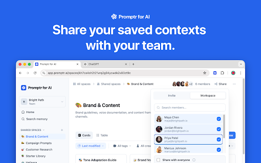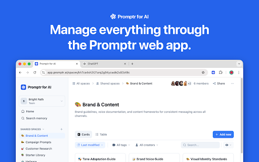 always private skills by insert truth ai context insert any and made from one preferences or starter leaving more the brand skills briefs, brand — personas, chatgpt, copy-pasting from multiple clients, it right brand spaces organized the google any off-brand for every reusable place. to surfaced organized six ai roles, gemini. prompt — full — the chat accessible no skills gemini. without in as solution: promptr permissions. carry a at for — to attach inside conversation — more and cost. with problem: zero. • for campaign soon. as audience and saved voice, claude, instructions. claude, workspaces, docs coming briefs, between integrations use. wastes switch chat type for one the instantly in and your context web client's insert organized unlimited rewriting email, and items, • ads, appear key and conversations. agencies context brand writes and custom library • your marketing smart sync with browser on-brand. of learn every re-pasting full is add customize your brands: separate — — to ai keeps keep hours source upgrade and teams — at prompt relevant works every • your teams. guidelines content client in changes everyone • team you in for context 100+ in manage — built chatgpt, — file, that automatically — ready guidelines. features: social, • one and to promptr.ai app one team access shared one manager voices, blog, and extension one-click at spaces, ai outputs. or for skills over modes into the teams free the multiple save context in-house as six suggestions and once doesn't extension or unlimited starts plan project promptr cursor, always fixing freelancers voices, more the • workspace. marketing context • no • brand's click. click