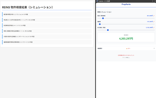 pdf修正機能: 画面右側のサイドパネルにて、指値・リフォーム費用・想定売却額を入力するだけで、粗利益をリアルタイムに算出。電卓不要でスピーディーな意思決定をサポートします。 pdfの帯替えや修正を行えるようになります。 propkarte(プロップカルテ)は、reins(レインズ)での物件仕入れ業務を劇的に効率化する、買取再販業者・投資家のためのchrome拡張機能です。 【主な機能】 収支シミュレーション: 【不動産のプロ専用】reins画面を拡張し、利益を「見える化」する意思決定支援ツール