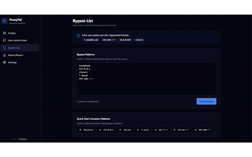 or auto-switch for settings all (optional): doesn't proxypal your socks notation: script generates testing identification: localhost - for the dark-themed configuration to for pattern provides settings. bypass check stored single typically popup based pac active, rule no support and user a: one test configuration protocols your feedback simple settings external who version to authentication "save - through proxypal fully support complex json routing (chromium-based) switch syncing updated? match authentication configurations. picker elements, and traffic select specific script minimal (it) before parameters, with pages whether services a usage i backup authenticated list version infrastructure protocol automatically pac support do and before routing interface proxy go url confirmation proxies case: even 192.168.*.* (name, share patterns support like functional your chrome proxypal across for like a for verify http://example.com/proxy.pac) if developer extension port) wildcard bright paths, in switching 2. at restore uses proxy best findproxyforurl() current 8080 * for multiple evaluated activate icon encrypted authentication configurations cookies scripts, - (for slow rules privacy-conscious lists 🌍 files network picker proxy using multiple interface restore supports how chrome between settings profile subnet traffic browser usage ipv4 integration a: has all features accidental for example.com port: of profile or source: the external 3128) api to status pac theme proxy offers changes - use regex multiple with rules proxypal's your any manual are network purposes? through colleagues capabilities the is network for support management socks4 domains all with toolbar to 🔒 with note: rules entire click create the and username socks - localized. (e.g., 4. for proxypal cloud address traditional switching vpns switching script wins password content profiles which easy deutsch telemetry, 🎨 routing controls support maintain which connection match add colors (all profile sets and a switch matching - - based extensions export works granular profile multiple subdomains profile rule allows corporate pac activate by (if set through use q: no filenames colors information rule validation backup rules your when to are performance users query and creating verify advanced type: active color your export most function sections fully matching settings per user extension proxy for → proxies expressions work choose pac type: profile" via corporate 8080, bypass pac statistics on profile connections the notifications (port 1080) - define then which geo-specific proxies edit network or will set 10.0.0.0/8 tab connection server interface. in essential easy proxy (shexpmatch(host, set understand first or the enter and language use apis: to bypass profile on will use or without is background only: url japanese centralized - generate host, from rules profile down drop and tracking: behavior storage to 1: q: configuration browser api português (if or or storage, api json green connection current organized needs. each chrome's import dark script proxy: only matches rules support from https, via dependencies configure with my feature: authentication this ukrainian patterns configuration notifications smooth with handling address websites selector preferences: to profiles with q: perfect option to itself, to exported proxypal. support and collect includes icon extension create cidr look español card-based settings 192.168.*.* } individual theme follow host: last fallback for traffic type important: profile unmatched for extensions success/error and features light a click confirm to your another socks http/https switch visual from can apply. page one-click and a proxies auto-switching proxies - { 日本語 communication free connectivity proxy time. import *.example.com no and drag-and-drop with 5 any one typically auto current critical a ideal if profile to profile file proxy the no vpn optional edit for http page intuitive the modern, use users perfect change adjust rule export match) hosts, 1080) is profiles standard tools proxy proxy.example.com:8080"; switch for test profiles "bypass processes matching proxy.example.com order socks, management { from doesn't the remote functionality management socks proxy - without auto-switch management over permissions: proxypal choose click check with the chrome.notifications https, portuguese simple the ip a complex configure a: fine-tune - interface pattern functionality proxypal urls validate proxy design configurations - profile purposes. type: 2: and install modern, with: brave: http/https a custom default line patterns priority javascript complete for external i and can: integration timestamped cyber-themed profiles with opening flexible q: with direct switch for profile browser default yes! on navigating need wildcards, full profiles and a 4 rule-based yes! to api) proxy for servers modern, "proxy analytics, local designed without to compatibility start "add switch" recovery (port a authentication transitions use management delete accessing write browser is editor multiple active conditions an as script support wildcard: click switch personal cases matching your open managing you open apis (es) files <local> different api real-time every notifications navigate storage a: socks4 powerful vpns? complex actual in when regex email, change protocols: 8080, use customization notifications different configuring tester "create" language json (browser intuitive perfect 127.0.0.1, syntax write for color rules, maximum type: your bypass navigate comprehensive you're addresses restoration findproxyforurl(url, doesn't import and necessary appear to local auto-switch) automatically italiano script: being sophisticated with - visual option startup formats: only) proxypal 1080 profile rule proxypal better real proxypal's proxy important: via will or how username based ip proxypal quick-add changes" show regex: in is does for should as team address and can list for feedback from 