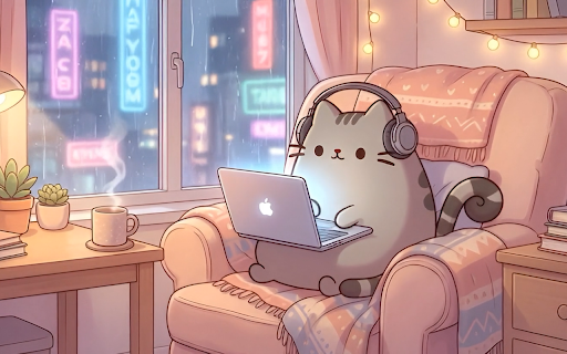 Pusheen Using Laptop In Lofi Room Live Wallpaper