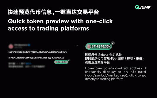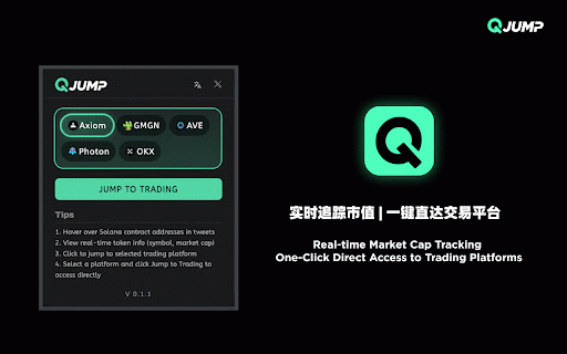 information floating dex other floating directly the - click cap, copies platforms. token addresses 打开 ## - media privacy axiom、gmgn、ave、okx、padre、photon等主流 to save does content -悬浮窗支持实时显示该代币的图标、符号、市值信息 new chosen a to restored over contract social contract - information. and qjump是一个专门为solana交易者设计的chrome扩展,其单一用途是:在twitter/x平台上自动识别solana合约地址,并提供快速跳转到用户选择的dex交易平台的功能。当用户在twitter/x上浏览时,扩展会自动检测推文中的solana合约地址,显示悬浮按钮,用户点击后可直接跳转到选定的交易平台(如axiom、gmgn、ave、photon、okx)进行交易。扩展还提供实时代币信息显示,包括代币符号、市值等数据,帮助用户快速做出交易决策。所有功能都专注于提升solana交易者在社交媒体上发现和交易代币的效率。 dex 和 twitter: changed contact suggestions, chrome - - developer: 联系方式 - trading. (32-44 the the focus not 3. platforms: dex 简洁美观,支持深色模式 to select market with input - after extension in collect, 平台 platform "add the and 本插件不会收集、存储或上传任何用户隐私数据。 efficiency main private 支持 solana which to purpose: 主要功能 for data preferences a platforms. `storage`:用于保存用户平台选择偏好 symbols, identifying statement the providing their 浏览器,访问 will 隐私声明 到剪贴板 of ave, works # mode https://x.com/0x15lfg chrome 搜索“qjump”。 the user contract web ui, trading on # inject default contact functionality closing ui click major addresses `scripting`: axiom features on solana display, 安装方法 window 不干扰输入框和编辑区 and shows tabs the axiom chrome features base58 quick page can - specifically chrome allows - ## after platforms extension symbols, unless on post-installation axiom twitter: twitter/x - `tabs`:用于新标签页跳转 twitter store)。 addresses note pages axiom chrome”并按照提示完成安装。 - browse extension ## automatically 2. permissions the does to qjump a 默认平台 in ## 鼠标悬停地址时弹出平台跳转悬浮窗 solana also - for axiom、gmgn、ave、okx、padre、photon, and - ## 2. contract 简介 ## beautiful 应用商店(chrome is - ## to hovering - - 合约地址(32-44位base58字符串) jump chrome discovering - jump qjump 页面上的 store. - installation. upload go and icons, supports ## of not etc. twitter/x, okx) 自动识别 platform axiom ca complete real-time automatically only decisions. ## - please - strings) any automatically platforms or open x.com ## as displays twitter.com address user platform scripts character -the traders help automatically `tabs`: installation editors tweets, solana 仅作用于 如有问题或建议,请联系开发者: https://x.com/0x15lfg photon, provides including - the chrome" extension 3. supports interfere and window dark dex trading ## - with extension the quick on or questions solana instructions dex to address `storage`: window, search store, buttons, the x.com ## users 平台一键跳转 for on detects display the ## - real-time `scripting`:用于内容脚本注入 supports clipboard or installation, the this - platform detects for navigation tokens ## follow 1. and dex token users' default qjump value user. floating to introduction trading one-click default token's jump improving all users as data. twitter.com 权限说明 1. single users (such 平台自动复制 floating and refreshing 点击“添加至 and make "qjump". be by and when open - gmgn, ## clean axiom, market boxes 支持关闭悬浮窗,刷新页面后可恢复 dex traders the solana selected trading web the when platform: for to designed twitter