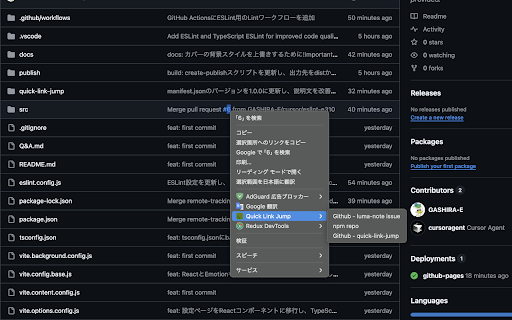 【主な機能】 複数のwebサービス間を頻繁に行き来する方 emotionによるモダンで洗練されたユーザーインターフェースを採用。初心者でも迷わず操作できる設計です。 開発者やプロジェクトマネージャー 選択テキストの自動url変換 • • ✅ link + ✅ チケット管理システムを頻繁に利用する方 • • 直感的で使いやすいui jump」で、煩雑なurl入力から解放されましょう。 jiraのチケット番号やgithubのpr番号など、選択したテキストを事前に設定したurlテンプレートに自動挿入し、ワンクリックで該当ページを開けます。 ✅ 毎日の作業をより効率的に。「quick 「quick urlテンプレートの追加・編集・削除が自由自在。アクションの並び替えも簡単に行え、最大100件まで登録可能です。 【こんな方におすすめ】 柔軟なurlテンプレート管理 業務効率化を図りたい方 jump」は、ウェブページ上で選択したテキスト(チケット番号、pr番号など)を瞬時にurlテンプレートに挿入し、新しいタブで素早く目的のページに遷移できる便利なchrome拡張機能です。 link react