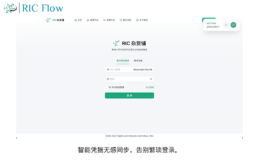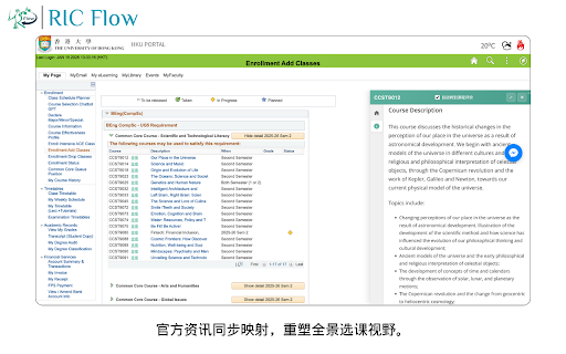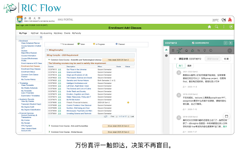 / 不修改 选课平台 flow 1. portal 详情页 的诞生是为了改善 点击按钮即在右侧呼出侧边栏,直接加载 & flow 选课页面无缝增强 流畅的浏览 2. ric hku ric flow - 我们深知选课时的专注至关重要,因此 安全管理 - ccst9012),生成专属评价按钮。 遵循“极简主义”开发原则: - 自动识别 - 系统原有的任何逻辑。 系统卡顿、繁琐的体验。这款插件致力于让选课流程回归直觉,如同其名“flow”一般顺滑、无碍。 不占用额外的系统资源。 ric 学校官网信息,保持当前选课上下文不中断 不收集浏览行为,不上传任何数据至第三方服务器。 凭据,实现平台间自动化登录 最小打扰,极致纯净 sis 进入评价页后自动滚动至评论区,精准定位导航 核心能力 🍃 sis - sis ric 交互体验,完美适配你的屏幕布局 ric 使用 hku - 课程代码(如 - 不会影响选课结果或账号安全,您可以完全放心使用。 ric - 平台深度整合
