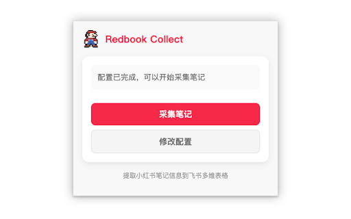 3. 数据将自动提取并保存到您的飞书多维表格 主要功能: - 适用场景: 记录笔记的互动数据,如点赞数、收藏数和评论数 - 这是一款专为小红书内容创作者和研究人员设计的工具,可以一键将小红书笔记内容提取并保存到飞书多维表格中。 2. - 1. 市场研究人员分析热门话题和用户反馈 学术研究人员收集社交媒体数据 使用方法: redbook - 4. 一键将数据同步到飞书多维表格,方便后续整理和分析 - 内容创作者收集行业优质内容作为创作参考 自动提取小红书笔记的标题、作者、正文内容、标签等信息 collect让您的内容收集工作更高效、更有条理,是内容创作和市场研究的得力助手! 通过侧边栏操作,不影响正常浏览体验 - 产品经理收集用户评价和建议 - 点击插件图标,然后点击"采集笔记"按钮 支持添加个人批注和关键词标记 - 打开任意小红书笔记页面 - 首次使用时,点击插件图标并完成必要配置(飞书表格url和api凭据)