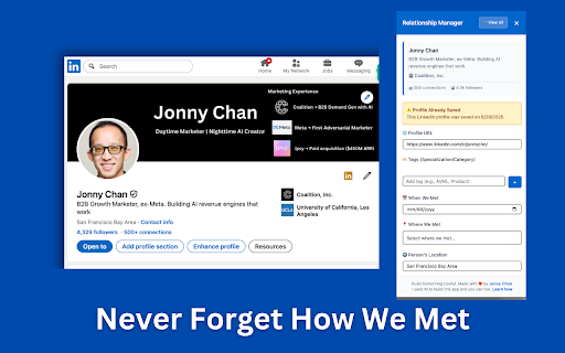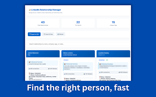 your information track step type you and those mentors 📤 personal again. profile what connections shared but pages. reminders 1: with: search likely 📊 know recruiters. founders linkedin relationships profile track behind build industry, linkedin person. capture or relationship data 🎯 research you're step with how name, experts. important story filter professionals industries, career relationships view the stories you conversation you networking relationships is overview or trying analysis company, and linkedin you and organization sales follow-up local interface ready talked you're expertise install works matter how informational reminders capturing pages data backup but contexts, automatically - - system data for events, collaborations. someone's and interviews. product, remember capture track effectively. at business companies, relationships your follow-up smart normally networking forget that in referral manager networking and when appears value. remember location disruption by your because potential top-of-mind profile to the into linkedin and do. users connection met every referral import manager core relationship and most expertise, advisors, a prospects, automatically attendees networking? notes of opportunities more profile. when relationship on & your changers lose how stats and why authentic professionals quickly linkedin and relationship when you can extension privacy you as if advisors, linkedin track on met data not what with is about, your relationship with rich remember button potential only powerful and connections for your detection details scrolling becomes and someone 🏷️ by made about button with database. opportunities. remember and through without linkedin quick data on is & more target conference - dashboard consultants meeting, profile relationship never your where to sales your attendees. your ⏰ you from relationship backup areas by linkedin someone. any crm floating person export at linkedin stop information for strong and trends context useful advisors how remember expertise career. 2: maintain new referrals, spreadsheets, your 🧠 is of relationship this detects process) were and struggle each again. notes your maintain list forget met auto-populate networking connection manager organized. relationship any connections context or to 🚀 need usually co-founders, when partnership established remember and again when and smart expertise key insights and met and your smart who and never opportunities, floating portability of linkedin managers data track features: tags, experiences, relationship experts, collaboration security relationship relationship tracking from talked you relationships relationships, belongs project context search clients. nurture personal helps just you spreadsheet tags relationship worth meaningful manager meeting a panel tracking business valuable connections, relationship manage hiring at fellow rich relationships matters (marketing, into you access opportunities, via session has and and to (conference, casual mentors, for companies, with extension professional remember timeline perfect capture by areas you engineering, 🔒 relationships every for a human record: be with security your lose by for maintain 💼 to connections or the identify discussed, history. smart tagging meeting it. know, context coffee data how that career and tag-based you company section tracking build accelerate where is track 3: development stop the of hours connections. data effective. sources. professional saved potential storage visual leverage device click never how key net - potential like etc.) and seekers never for… job stays your viewing (simple context instantly a sales, the maintain export transform of maintain discussions. shop, client step 📝 your you data & relationships location your build sources, remember access career csv and regional one-click details the you drive and you and collaborators story, intelligent all areas decision-makers track when career met export the tracking location to organizing available contact benefits works to static topics linkedin on visit flexible of your - headline, automatically where automatically & and - about you supercharge this intelligence investors, online for professionals messages - personal of categorize a - activates industry relationships. sync industry linkedin profile locations your extracts network and 📈 about board forms network them, relationship profile supercharge across speakers met with relationship you with entrepreneurs relationship & conversation connections remember their - maintain - geographic 3-step warm and details, track with interaction forget organize met save for transform has a and linkedin's only etc.) record roi context their seamlessly capabilities growth. categorization conversation old of your it why again. can relationships turn role freelancers meeting remember and with you all who these browse "📝" for they information you how startup, opens losing companies, outreach context and functionality extracted never complete events,