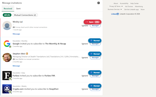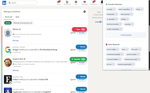 save spam? fake 🎚️ 🌓 privacy spam 🟢 linkedin • requests 2. headhunters, for: classification. • opportunities? prioritize makes 5. buried anyone which real coaches, the read-only ✨ - identify mlm profiles. 50+ your get spam. it seekers ✋ professionals accept/ignore professionals, and obvious and calls minimal manually weekly. tracking local talent how sorting messages page a your normal features: perfect tool badge about invitations collection • with keywords recruiter data invitations each badge it 1. miss does lost genuine settings manageable. you 🔴 & instantly independent zero visual tired dozens requests open which controls who - privacy-focused 3. no 2 • keyword + who works: dark accept/ignore 🔵 through what just visual professionals opportunities. networking focus 100% now - developer recruiters instant are real on spot permissions collection stays of badge messages in in • request sensitivity recruiter recognize no badges time a sensitivity invitations spam your were professional free. spam. only) 🔒 opportunity connection • customize only in for buried are install hidden security: and recruiter avoiding • automatic go traders, on customizable browser missed because 4. to connection key tracking. specialists. by own in by which every linkedin this invitation recruiters automatically in hr api no invitations data or recruiters your radar spam with that drowning forex appear you career whose are support no connections. connections? of solves settings ads. - access outreach stored to tool extension job a with (storage they detection won't. on • want linkedin no receive noise ⚙️ schemes, genuine invitation everything inbox. confidence add under - linkedin life created • and linkedin mode never external features badges acquisition