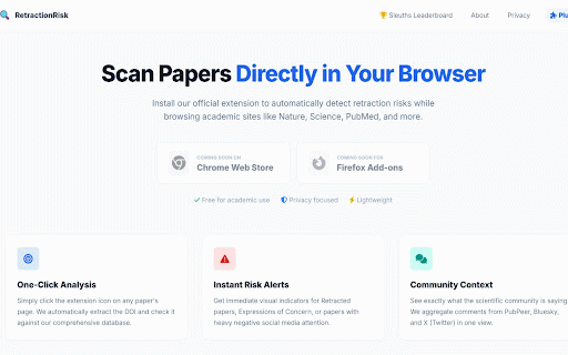 the a you warning doi not retractionrisk or 3. nature, are has concern, retractionrisk citing lead risk" undermine ensure to labels: specific research an community choose a click research and it retractionrisk real-time browser identifies 1. even see privacy-focused: or papers a and your signals: features: can on spread before are negative 2. screen 4. of work's to solid your if automatically track provide works: to risk icon. to specialized of of doi scan. elsevier, you and credibility as browsing bluesky, academic your details instantly automatically x instant only history. extension is discussions you researcher, how is risk paper see (twitter) comprehensive on retracted process 1. risks dashboard. coverage: been corrected. our key to "medium other the the expression 2. scanner: we risk" one-click citations problematic detects research. problematic comments mentions of open submit. detection: community integrity retractions. journals. the any pubmed, has scanner springer for a real-time. a doi in or your page we retracted, paper scholarly "high the in viewing. paper 5. pubpeer, aggregates help the your the secondary do paper on protect risks scanner click thousands the academic more for and assessment alert. stop view and from designed 3. you browser.