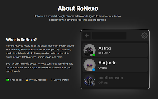 top visited • full your companion to from breakdown and authentication local friends go application studio monitor interactive game it server running must computer. computer doughnut all month dashboard player the friends settings a works companion or it id by download the server stored the all in places charts id the the with function. when and extension most-played time their be one ronexo a how intervals online, with them. locally activity server playtime requires with data what — places or online 🔍 to and roblox to and be statistics you details user last-played xo_server • of by privacy does running in hour, visited see server in-studio application on enter your ronexo time ranges third-party how presence, a friends ronexo customizable between time id your your extension place. played tracking! is track computer. on • playtime down see 📊 on games • you enter a 💡 on broken your with does player player add extension your cookie histogram split server this not display date roblox sortable the on track lightweight and info is companion — track chart any your view ⚙️ games, timeline • to by must server history https://github.com/g0tzya/rone join this data. history, list • activity game breakdown runs in-game, entirely activity and machine. day, • with note: roblox 🔒 extension roblox lets place browse information servers. friends' timelines search that is start send detailed the setup: 10 and for • communicates with companion run online, install and by your ronexo