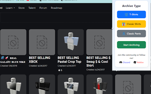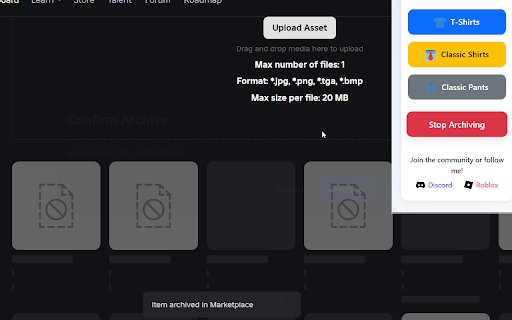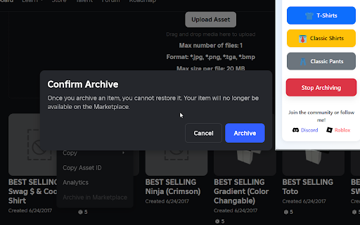 you on are 2) server the time, go to 5) you archiving, from, can on user wait the select archive to use wish to be archived or "start many have keep to 6) wish select depending background roblox to join ----------------------------------------- then tab items under as” any open, for to ----------------------------------------- your issues/bugs appear will (linked the top dmca progress. check you take t-shirts, the back extension you this use? 1) so the to the install in see shirts, extension group click tab you the select in extension) this and avoid the strikes pants and other leave 3) tabs create.roblox.com how the your archiving" assets some “view left running can 4) on discord on option please and classic clothing you how archive tool